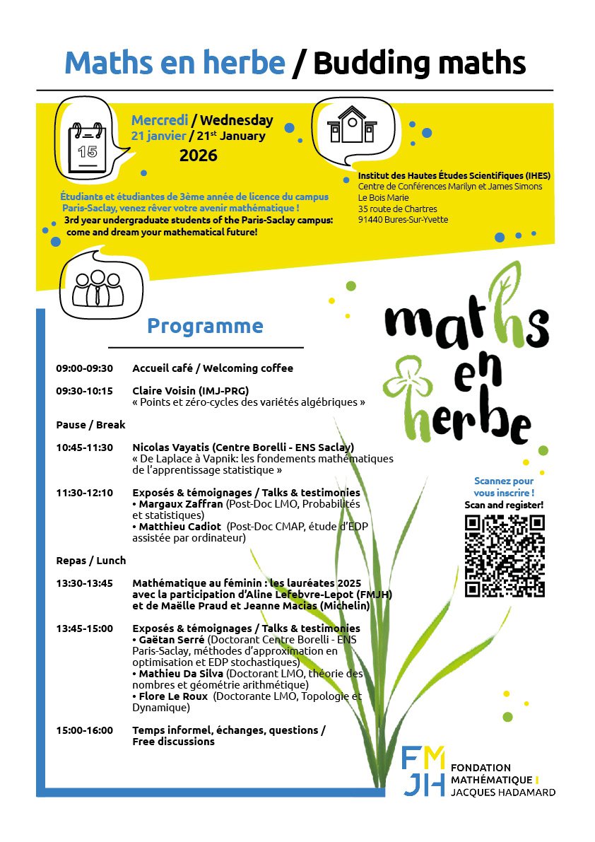 Following the success of the "Budding Maths" day in 2023, the FMJH has decided to continue this day of popularization and information on mathematics research for L3 mathematics students from the Paris-Saclay area. The idea is to present them with a lively and varied picture of what mathematics research is all about, so as to encourage them to get involved. 3rd year undergraduate students from the Paris-Saclay campus, come and dream your mathematical future!