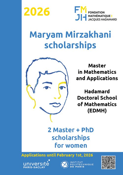 The Ecole Doctorale Mathématique Hadamard (EDMH) allows students to prepare a doctorate in mathematics on the Paris-Saclay area, regardless of the field of mathematics or the institution of registration concerned (université Paris-Saclay or Institut Polytechnique de Paris). The FMJH is delighted to offer Maryam Mirzakhani PhD scholarships for female students of any nationality in order to encourage them preparing a PhD within the EDMH. Like the junior Maryam Mirzakhani prizes offered yearly by the FMJH, these scholarships commemorate the life and work of Iranian mathematician Maryam Mirzakhani (1977-2017), who became the first female mathematician to win the Fields Medal, in 2014.