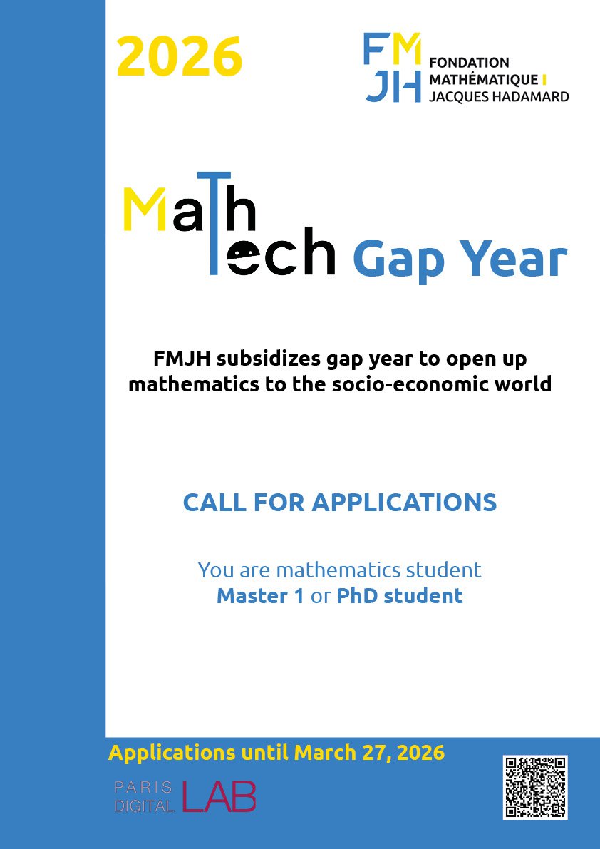 This program is aimed at students enrolled in the Master's degree in Mathematics and Applications co-accredited by Université Paris-Saclay and Institut Polytechnique de Paris, or in the École Doctorale Mathématique Hadamard (EDMH), who have so far studied more fundamental aspects of mathematics and wish to complement this initial training with a new experience that will enable them to understand and appreciate the application of mathematics to the socio-economic world, particularly through the many applications of Artificial Intelligence, during a gap year, this initial training with a new experience enabling them to understand and appreciate the application of mathematics to the socio-economic world, particularly through the many applications of Artificial Intelligence.