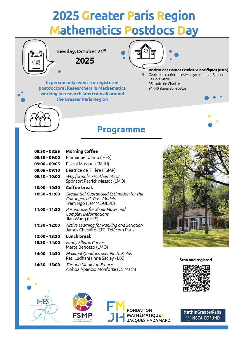 Cette année, la journée francilienne d'accueil des postdoctorant.e.s en mathématiques aura lieu le 21 octobre 2025 à l'IHES.
