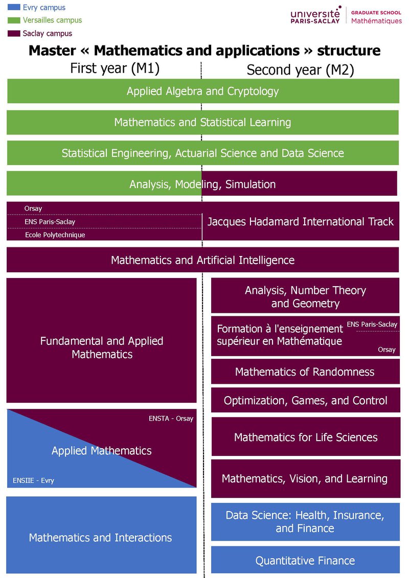 In addition to the combined M1+M2 tracks, three M1 programs are offered to provide an initial orientation: Fundamental Mathematics and Application, Applied Mathematics (Orsay campus and Evry campus), and Mathematics in Interaction.