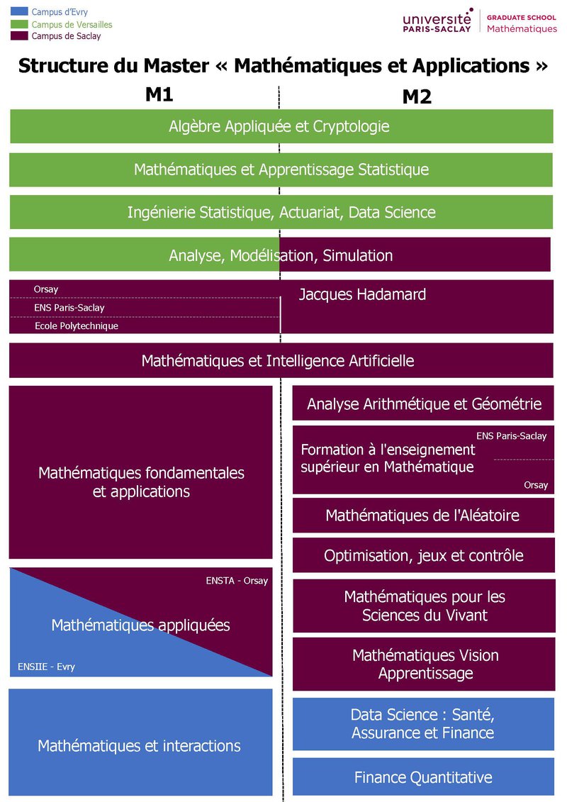 A côté des parcours M1+M2, trois parcours de M1 sont proposés permettant une première orientation : mathématiques fondamentales et applications, mathématiques appliquées (campus d'Orsay et campus d'Evry) et mathématiques en interaction.